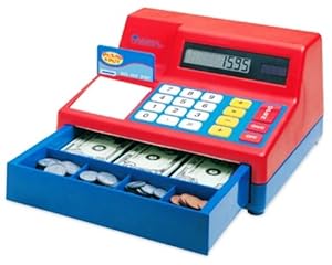 Well-designed with lots of terrific detail, Learning Resources' Calculator Cash Register completely satisfies a young child's hunger to play with bills, coins, cash drawers, and big numbers. The chiming cash register features a built-in solar calculator as its keypad, thus allowing kids to act as bankers, shopkeepers, and accountants all at once. A large cash drawer holds life-sized bills in four denominations (1, 5, 10, and 20), and four coin holders make room for embossed plastic pennies, nickels, dimes, and quarters. There is even a credit card slot that dings when you correctly slide the faux VISA card through it. A suggested-activities booklet is included. Requires a 1.5V button cell battery (included) to make the chiming noise. No assembly required. Winner of awards from Dr. Toy, FamilyFun Magazine, and Oppenheim Toy Portfolio.